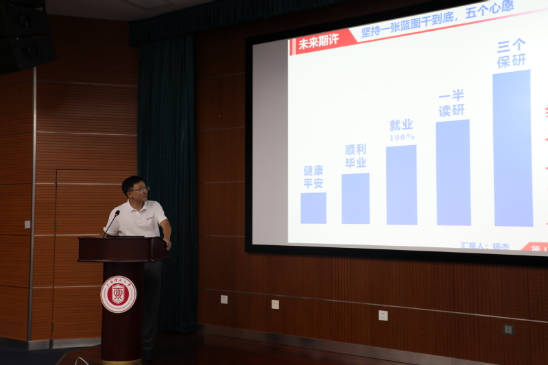 在经验交流环节,学院副院长、过程装备与控制专业优秀班主任杨杰老师,倾情分享了他的班主任育人心得。他用爱心走近学生、用耐心帮助学生提高专业课成绩,用诚心和学生交朋友。他“坚持一张蓝图干到底”,他许下5个班级心愿“健康平安、顺利毕业、就业100%、一半读研、三个保研”,毕业时全部实现。他通过真实、生动的案例,阐述了成为学生良师益友的有效路径与方法,其务实管用的经验为全体班主任提供了宝贵借鉴。